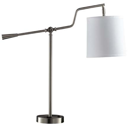 32-1/8" Polished Chrome Swivel Arm Table Lamp, on/off rocker base switch, 8' Silver 45° 3-prong grounded cord, with one convenience outlet, 8x9x9 White Linen Hardback Shade with Rolled Edges, with White Frosted Top Acrylic Diffuser. Recommend 1100 lumen LED bulb.