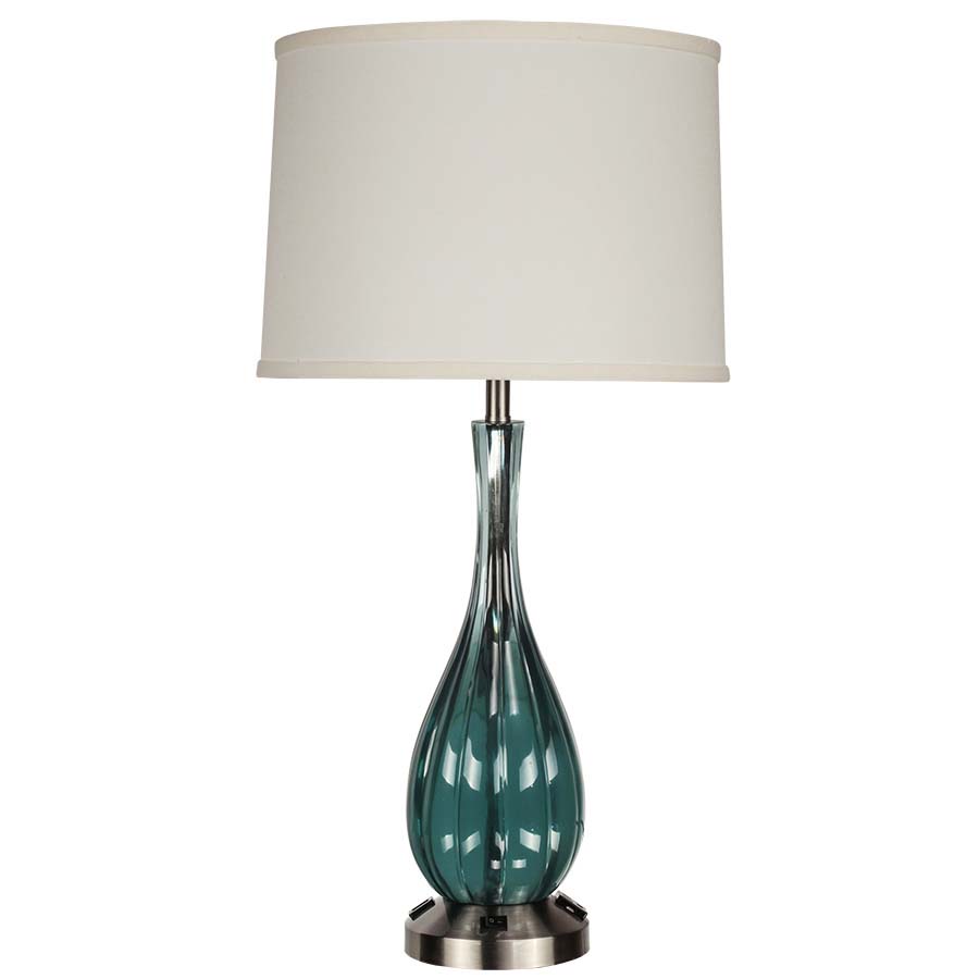 27.5"H Aqua Resin and Brushed Nickel Table Lamp, on/off rocker base switch, medium base socket, one convenience outlet and one USB port, 8' Silver 45° 3-prong grounded cord, 13x14x10 Linda Parchment HB Shade. Recommend 1100 lumen LED bulb.
