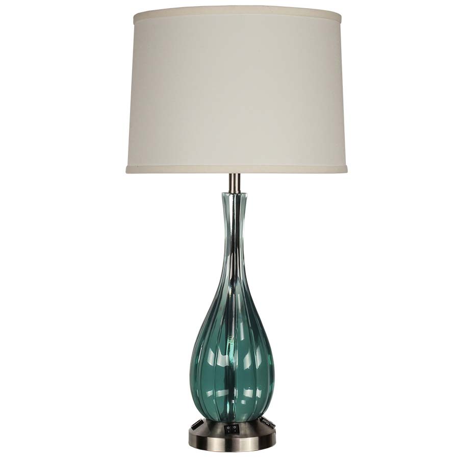 27.5"H Aqua Resin and Brushed Nickel Table Lamp, dual on/off rocker base switch, two medium base sockets, one outlet, one USB port, 8' SIlver 45° 3-prong grounded cord, 13x14x10 Linda Parchment HB Shade. Recommend two 1100 lumen LED bulbs.