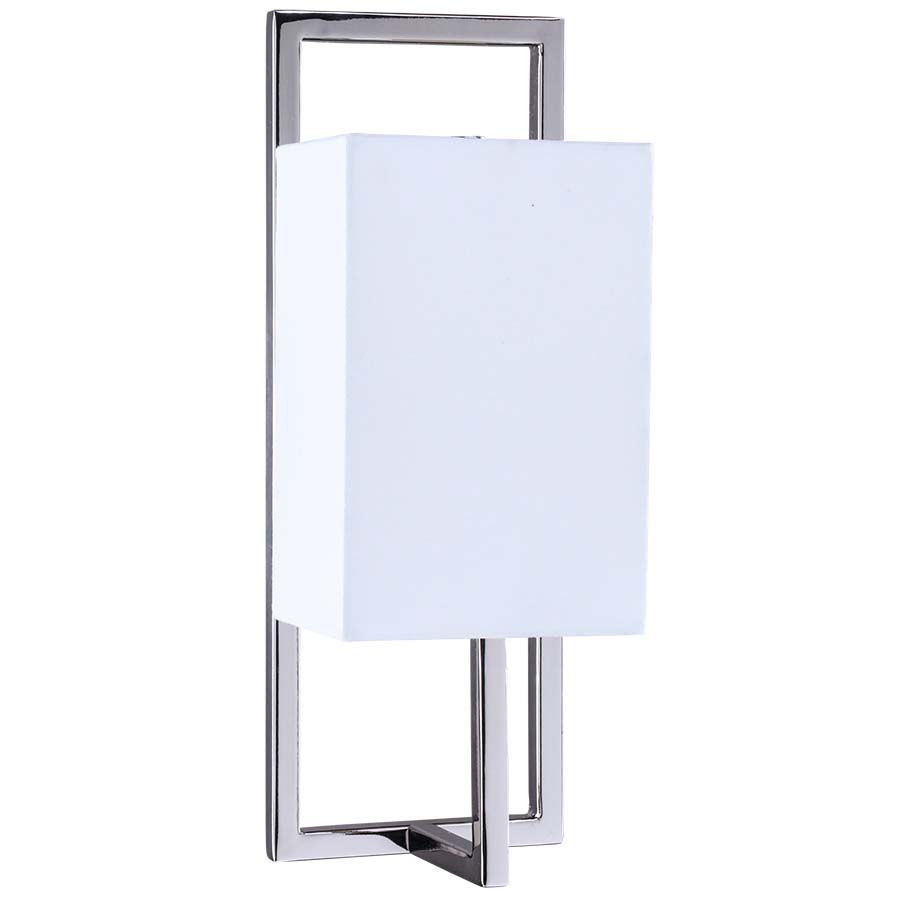13.5" Polished Nickel Wall Sconce, Direct wired, Medium base socket, with 4x5x4x5x7.5" Rectangle White Linen Half Shade. Recommend 800 lumen LED bulb.