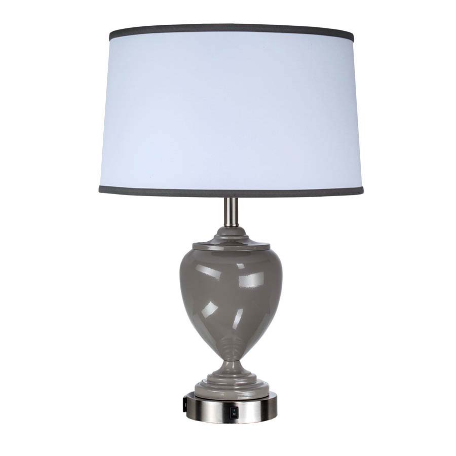 27"H Dovetail Gray and Brushed Nickel Table Lamp, medium base socket, on/off rocker base switch, one outlet, 8' Silver 45° 3-prong grounded cord, 17x18x11 White Linen Hardback Shade with Gray Trim. Recommend 1100 lumen LED bulb.