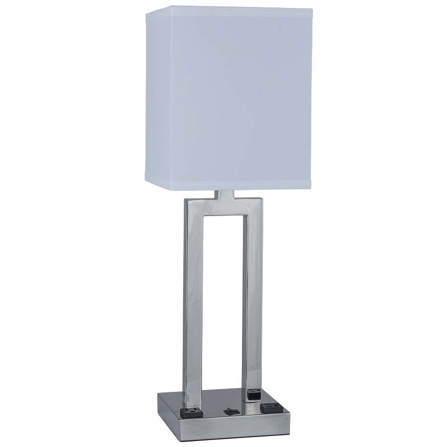 24"H Polished Nickel Table Lamp, medium base socket, on/off rocker base switch, two convenience outlets, 8' Silver 45° 3-prong grounded cord, 8x8x8x8x10 Square White Linen Hardback Shade. Recommend 1100 lumen LED bulb.