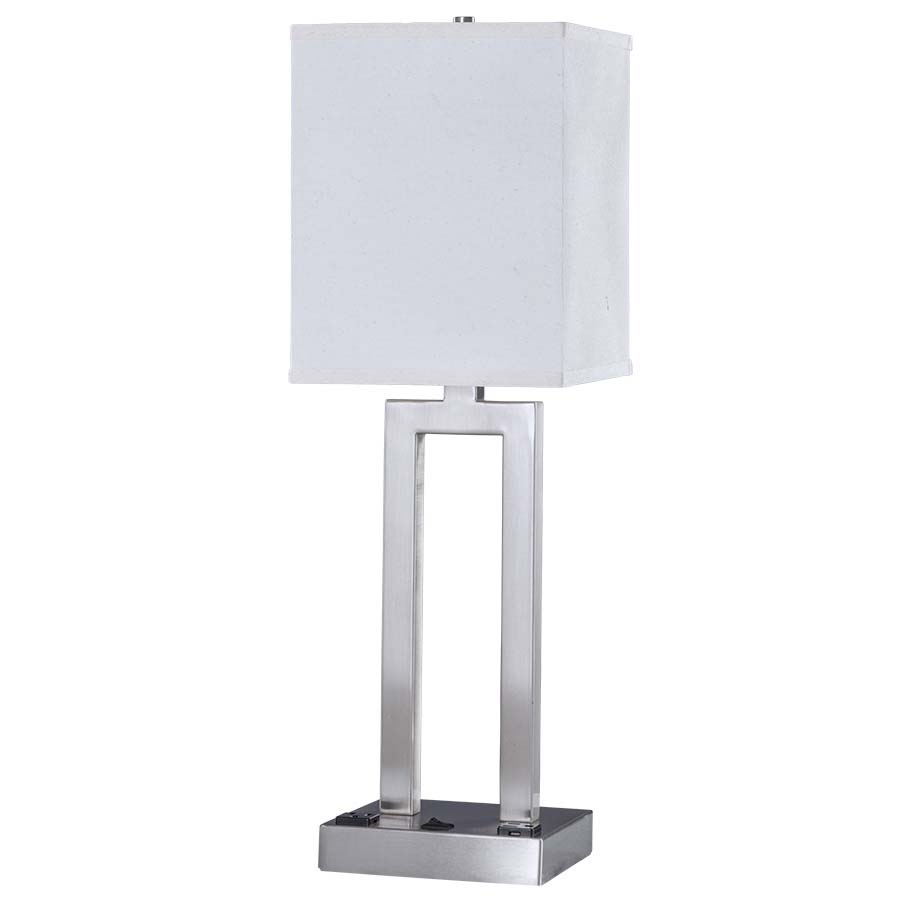 24"H Brushed Nickel Table Lamp, medium base socket, on/off rocker base switch, two convenience outlets, 8' Silver 45° 3-prong grounded cord, 8x8x8x8x10 Square Natural Linen Hardback Shade. Recommend 1100 lumen LED bulb.