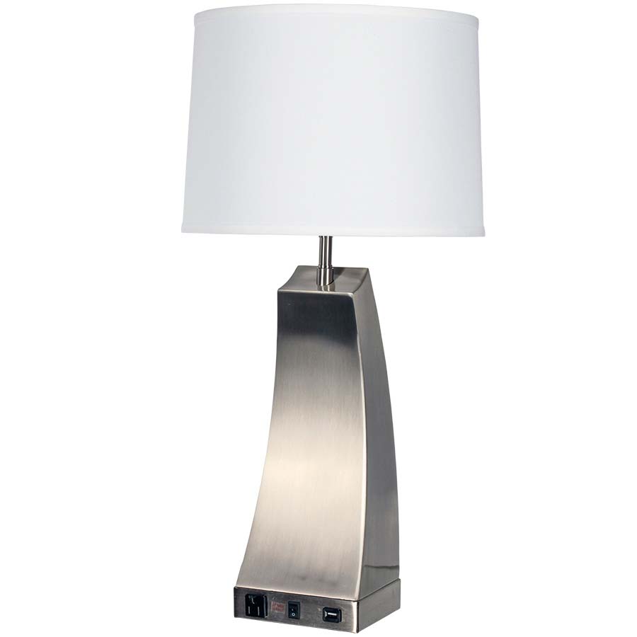 28" Brushed Nickel Table Lamp, medium base socket, on/off rocker base switch, one outlet, dual USB port, 8' Silver 45° 3-prong grounded cord, 13x14x10 White Linen Hardback Shade. Recommend 1100 lumen LED bulb.