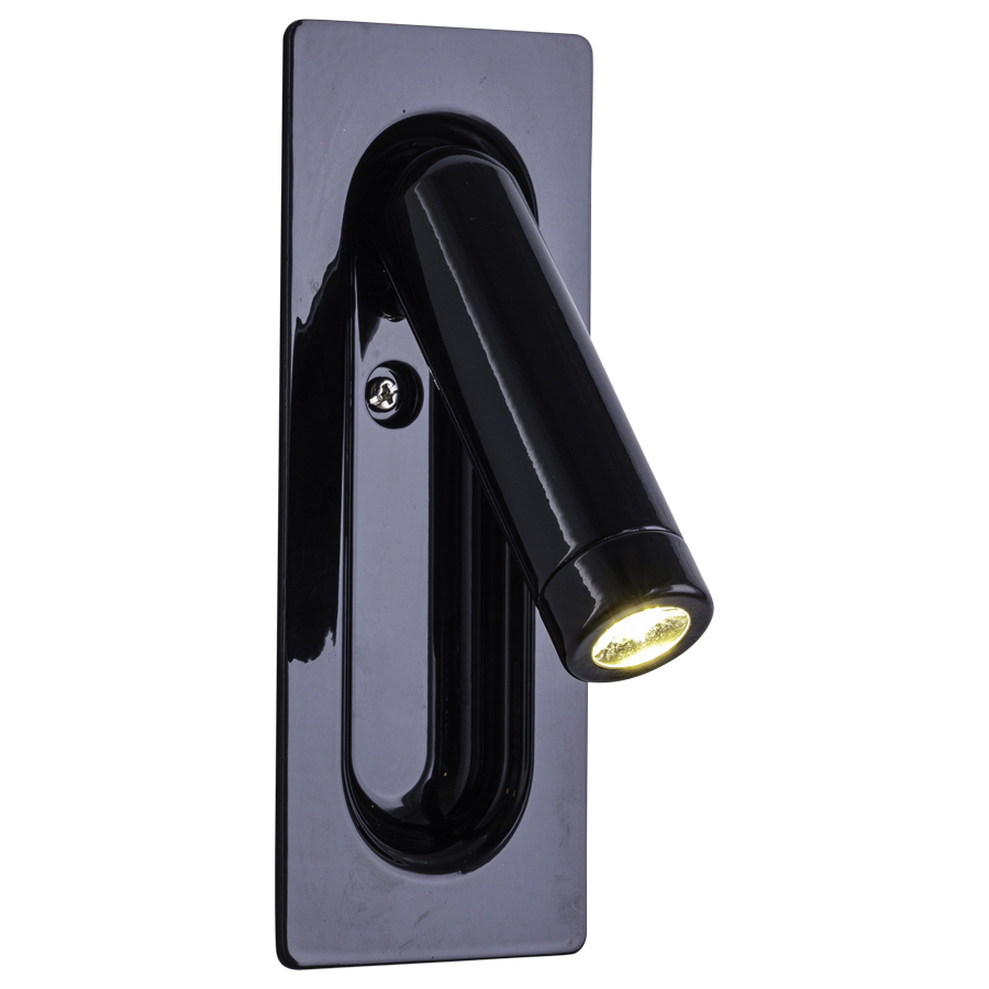 6-3/4" Glossy Black LED Headboard Reading Light, 3 watts, 2700K, 80 CRI, 240 Lumens, 8' Silver 45° SPT-2 cord exits out back of lamp, switches off when arm is closed, turns on when arm is opened
