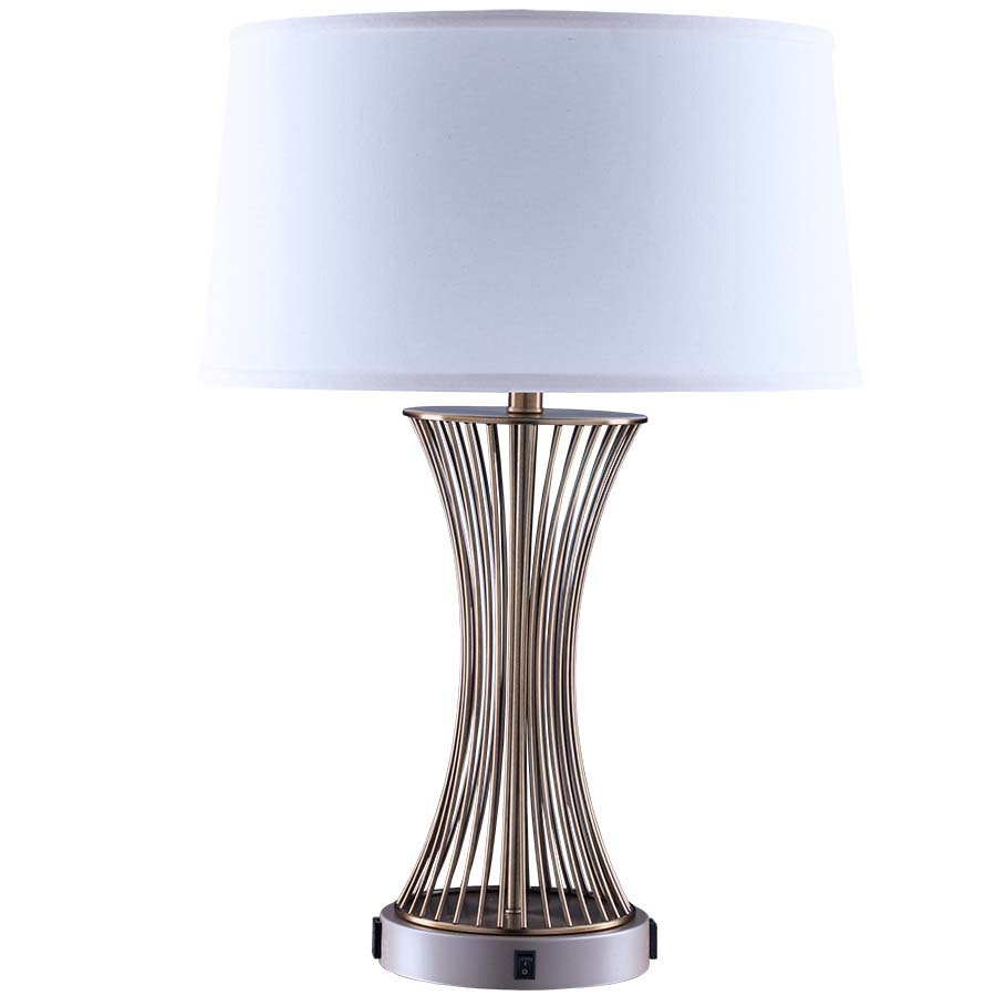 27" Brushed Brass and Champagne Base Table Lamp,dual medium base socket, dual on/off rocker base switch, 8' Silver 45° 3-prong grounded cord,two outlets, 17x19x10 Cream Linen Hardback Shade. Recommend two1100 lumen LED bulbs.