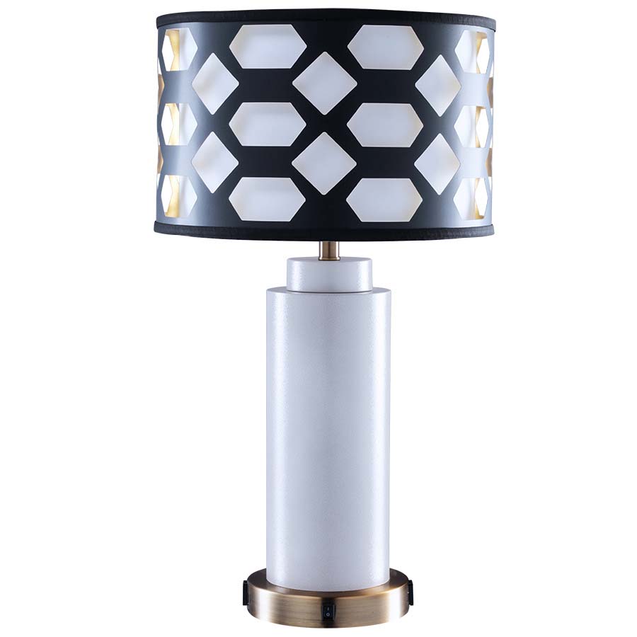 28" Brushed Brass and Antique White Table Lamp, medium base socket, on/off rocker base switch, two outlets, 8' Silver 45° 3-prong grounded cord, 12x12x10 White Linen HB Shade with 16x16x10 Black Pattern Outer Shade. Recommend 1100 lumen LED bulbs