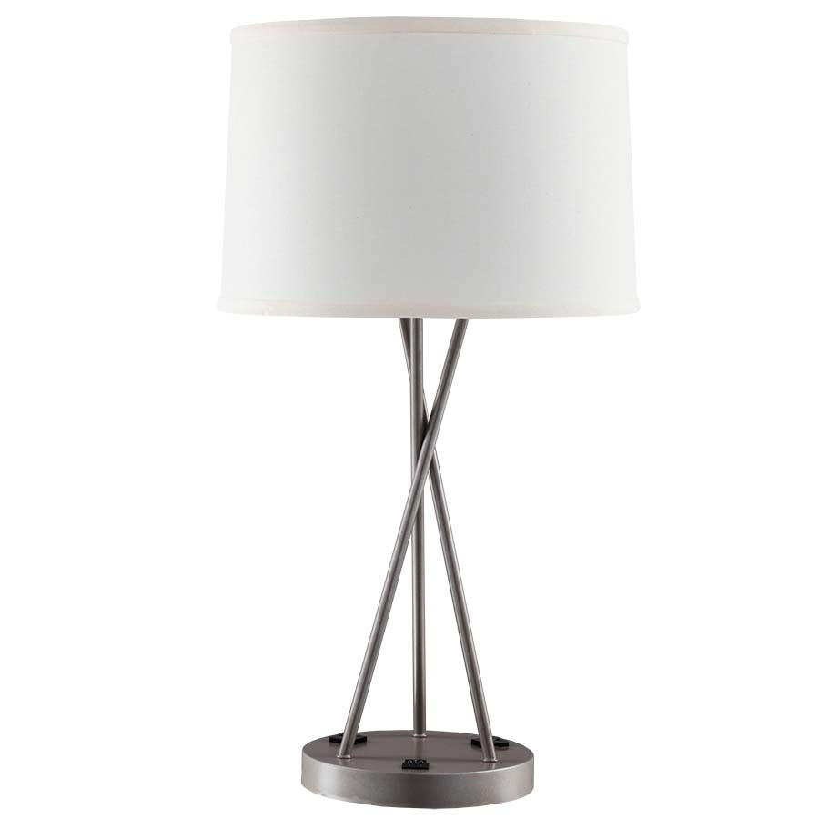 27" Table Lamp in Powder Coat Stainless Steel, two GU24 sockets, dual on/off rocker base switch, 8' Silver 45° 3-prong grounded cord, two outlets, 14x15x10 Natural Linen Hardback Shade. Recommend two 1100 lumen LED bulbs with GU24 base.