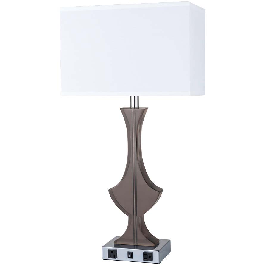 28.5"H Warm Gray Resin and Polished Chrome with Clear PC Table Lamp, dual medium base socket, dual on/off rocker base switch, two outlets, 8' Silver 45° 3-prong grounded cord, 8x15x8x15x10 Rectangle White Linen HB Shade. Recommend two 800 lumen LED bulbs.