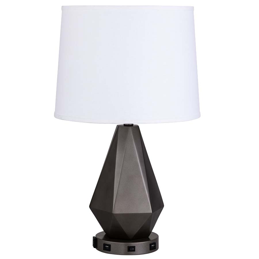 27" Painted Copper Bronze Resin Table Lamp, medium base socket, on/off rocker base switch, 8'Silver 45° 3-prong grounded cord, one outlet, two USB ports, 14x16x12 White Linen HB Shade with top acrylic diffuser. Recommend 1100 lumen LED bulb.