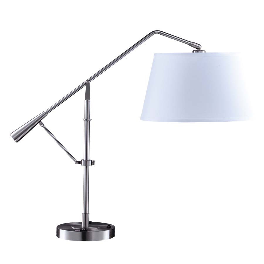 30-5/8"H Brushed Nickel Table Lamp, medium base socket, with swivel, on/off rocker base switch, 8' Silver 45° 3-prong grounded cord, two outlets, 12x16x9 White Linen Hardback Shade. Recommend 1100 lumen LED bulb.