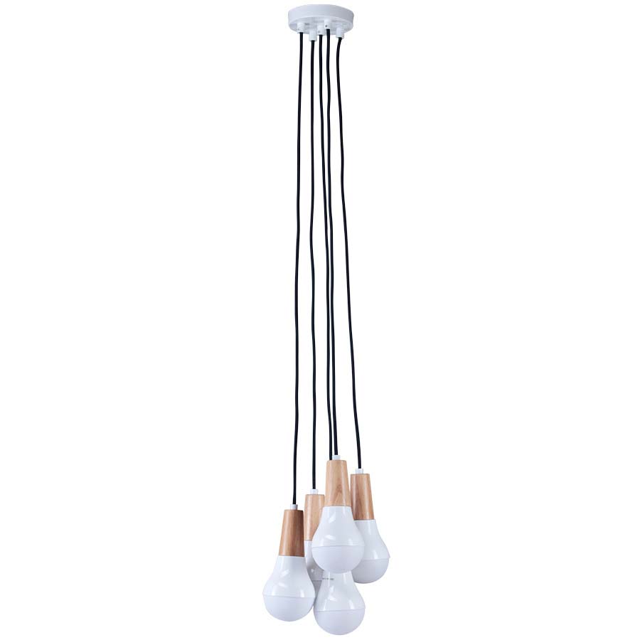 48" White and Oak Wood Pendant, five E-12 sockets, Navy Woven and 12' Black Fabric Wrapped 45° Cord, with White Acrylic diffusers. Recommend five 5 watt LED bulbs.