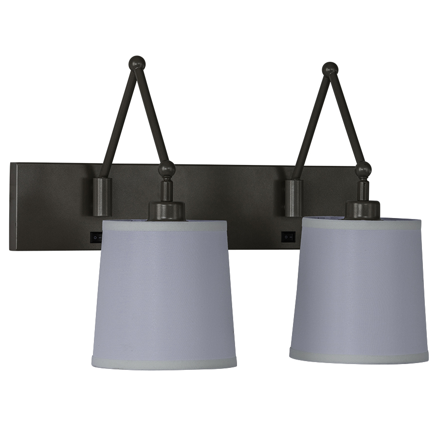 15.25"H Stainless Steel Double Wall Lamp, 2-GU24 sockets, 2-independent on/off rocker switches, 8' silver 45° cord exits out back of lamp, 6"x7"x7" Cream Linen Hardback Shades, Recommend 2-1100 lumen LED bulbs with GU24 base