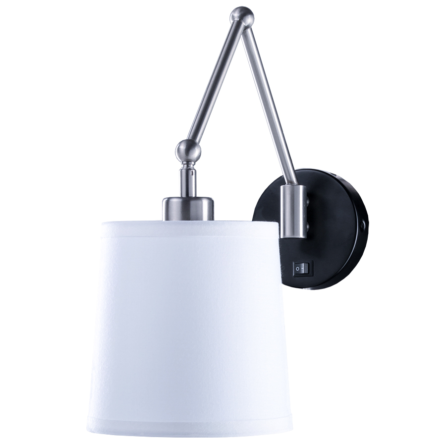15.25"H Matte Black and BRUSHED NICKEL Single Wall Lamp, one GU24 socket, on/off rocker switch, direct wired, 6x7x7 Cream Linen HB Shade. Recommend 1100 lumen LED bulb.