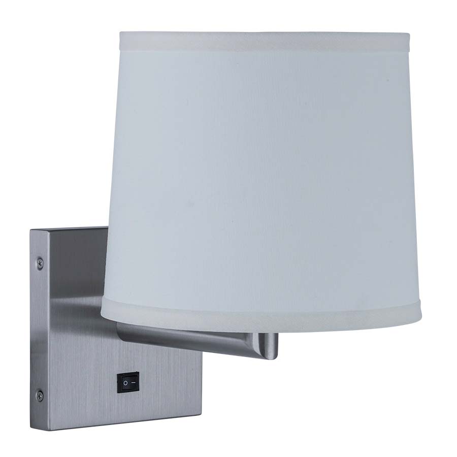 12"H Brushed Nickel Single Wall Lamp, one GU24 socket, on/off rocker switch, 8' silver 45° cord exits back of lamp, 8x9x8 Cream Linen Hardback Shade. Recommend 1100 lumen LED bulb with GU24 base.