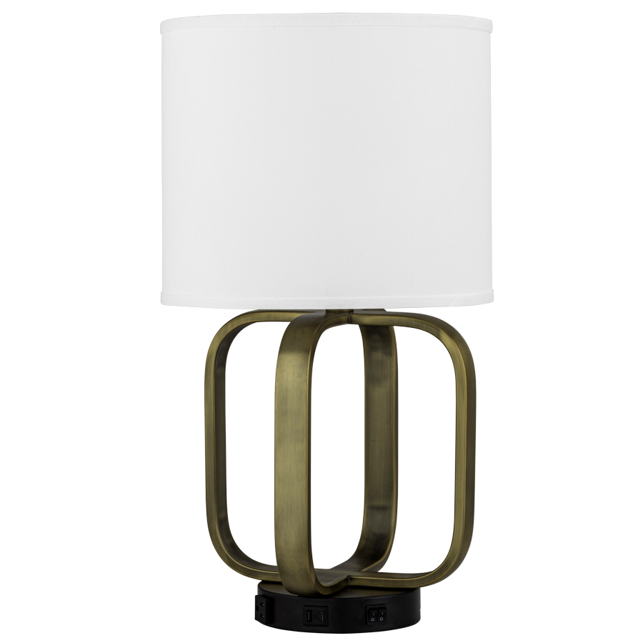 26.25"H Brushed Brass and Bronze Table Lamp, Dual GU24 socket, dual on/off rocker base switch, two outlets, dual USB A + C port, 8' Silver 45° 3-prong grounded cord, 14"x14"x12" White Linen Hardback Shade with top acrylic diffuser, 10" Harp & Finial, Recommend two 800 lumen LED bulbs with GU24 base.