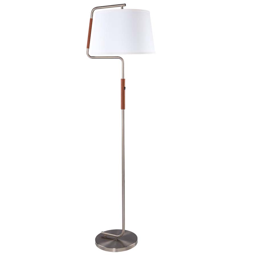 65" Brushed Nickel Floor Lamp with Brown Leather accent, two GU24 sockets, on/off rocker switch on column, 8' silver 45° cord, 14x17x11 White Linen Hardback Shade. Ships Knocked Down. Recommend two 1100 lumen LED bulbs with GU24 base.