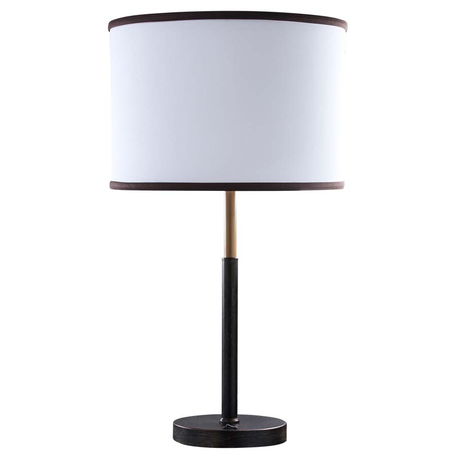 25"Brushed Brass and Oil Rubbed Bronze Table Lamp, on/off rocker base switch, 8' Silver 45° Cord out back of base, 2 metal prongs out the bottom (not shown in picture), 14x14x10 White Linen HB Shade with Brown trim. Recommend 1100 lumen LED bulb