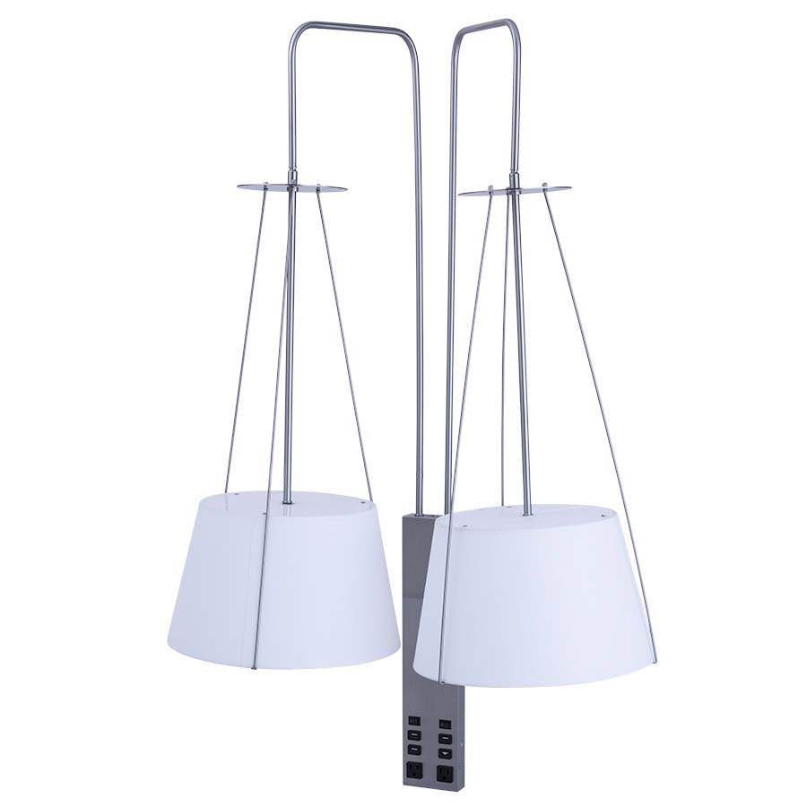 66.75" Brushed Nickel Wall Lamp,2-GU24 sockets, 2-on/off rocker switches at back plate, 2-outlet, 4-USB ports, 8' Silver 45° 3-prg cd,18" Cordcover,2-10.5 x 14 x 8.5 Cream Linen HB Shade top & bottom diffuser. Recommend 2-1100 lumen LED bulbs w/GU24 base.