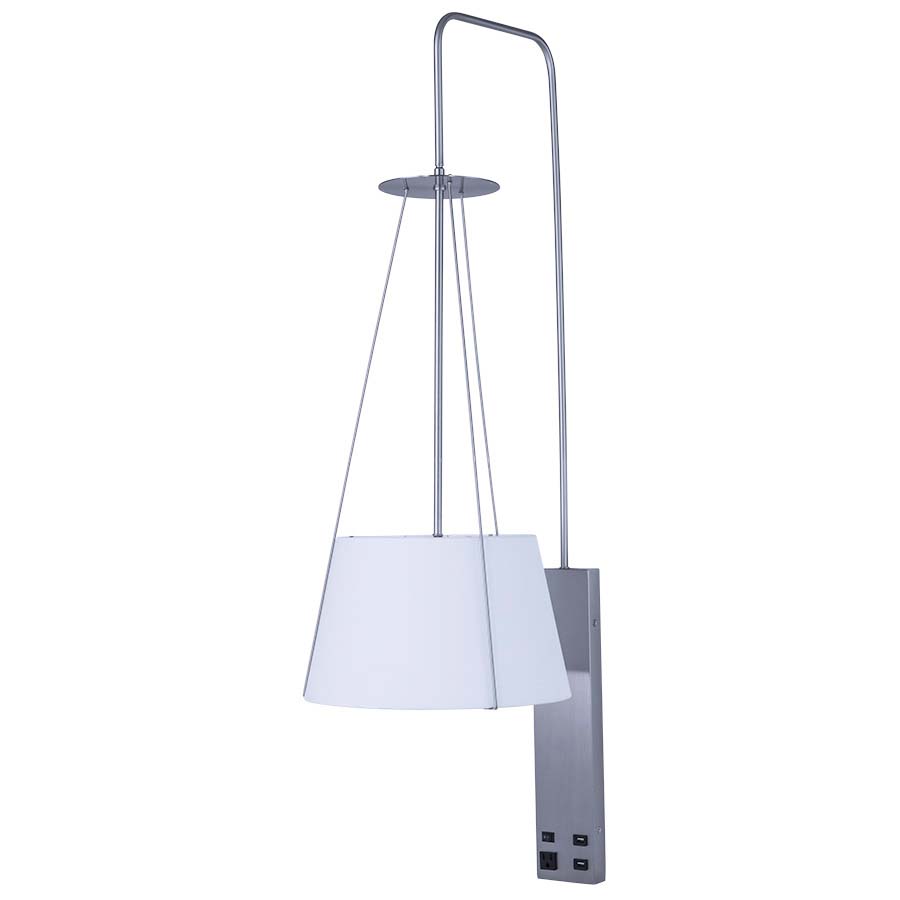 66.75" Brushed Nickel Wall Lamp, GU24 socket, on/off rocker switch at back plate, one outlet, two USB ports, 8' Silver 45° 3-prg cd, 18" Cordcover, 10.5 x 14 x 8.5 Cream Linen HB Shade top & bottom diffuser. Recommend 1100 lumen LED bulb with GU24 base.
