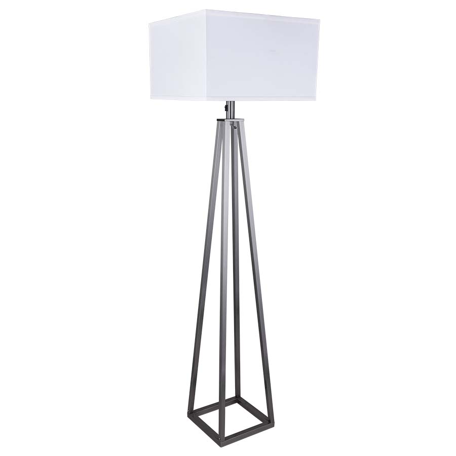 63"H Brushed Nickel Floor Lamp, medium base socket, on/off rocker switch at neck, 8' Silver 45° Cord, 17x17x17x17x10 Square White Linen Hardback Shade with acrylic top diffuser, 8.5"Harp & Finial, Recommend 1100 lumen LED bulb.
