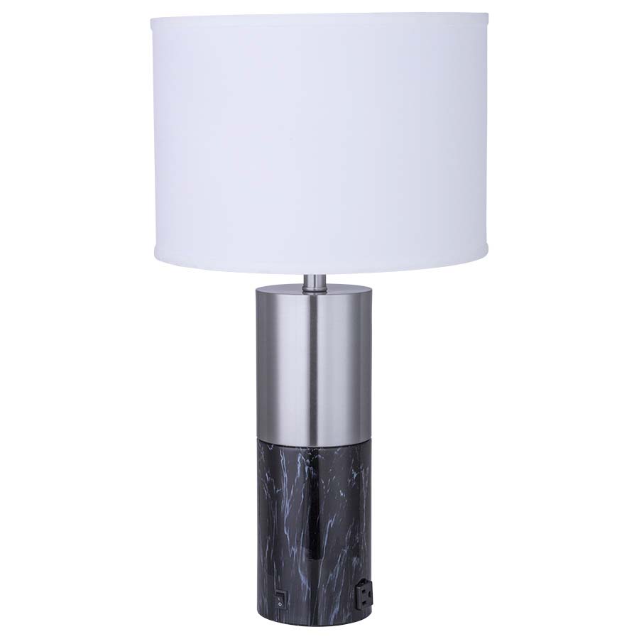 25.5"H Brushed Nickel and Faux Marble Water Transfer Table Lamp, medium base socket, on/off rocker base switch, 8' Silver 45° 3-prong grounded cord, with one convenience outlet, USB port, 14x14x10 White Linen HB Shade. Recommend 1100 lumen LED bulb.