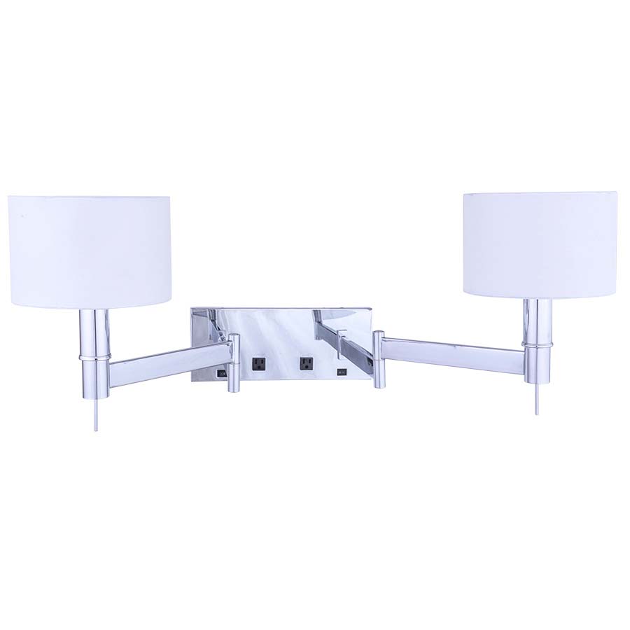 31"OAH Polished Chrome Swing Arm Double Wall Lamp, two medium base socket, two on/off rocker switch, two outlets, 9' Silver 45° 3-prong grounded cord,16" Cordcover, two 9x9x6 White Linen HB Shades and top diffusers. Recommend two 1100 lumen LED bulb.