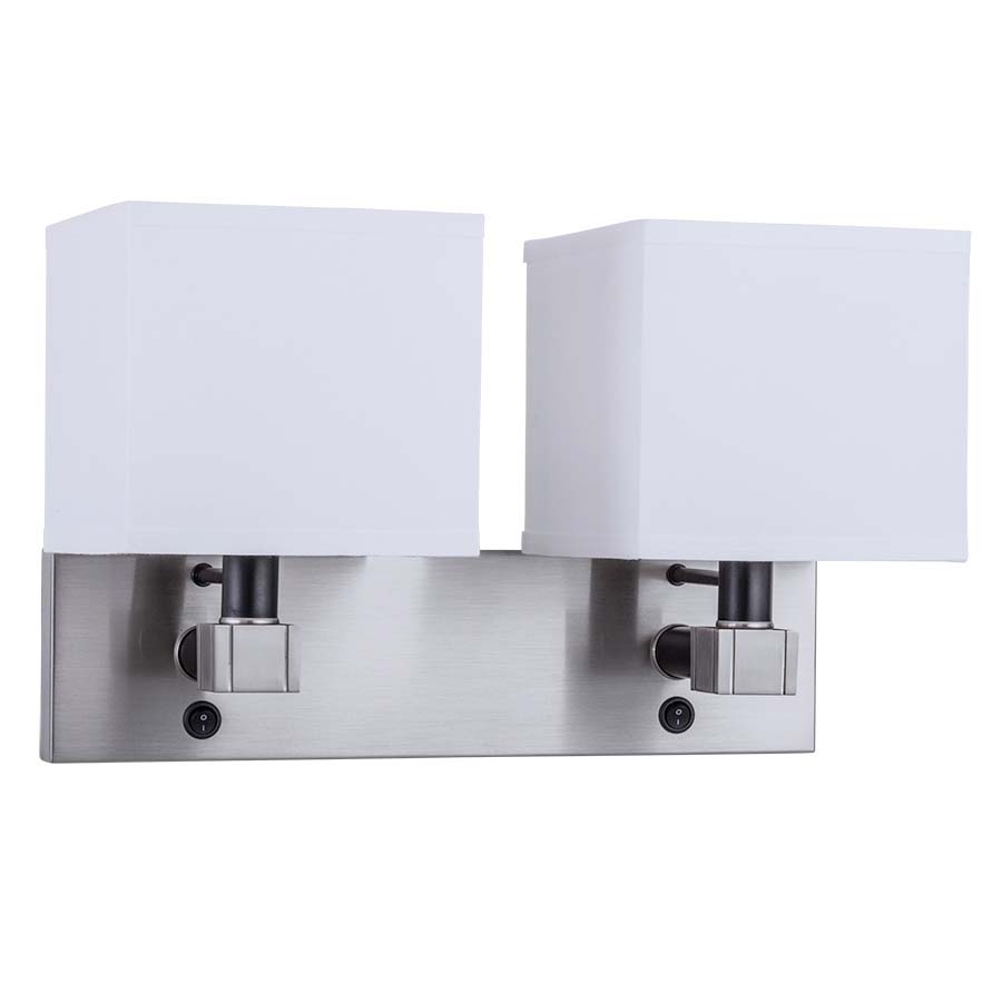 Double Wall Lamp, Brushed Nickel w/Espresso Accents, two medium base sockets, two on/off rocker switches at backplate, direct wired. Includes (2) 8"x8"x8"x8"x7.5" White Linen Hardback Shades. Recommend two 800 lumen LED bulbs.