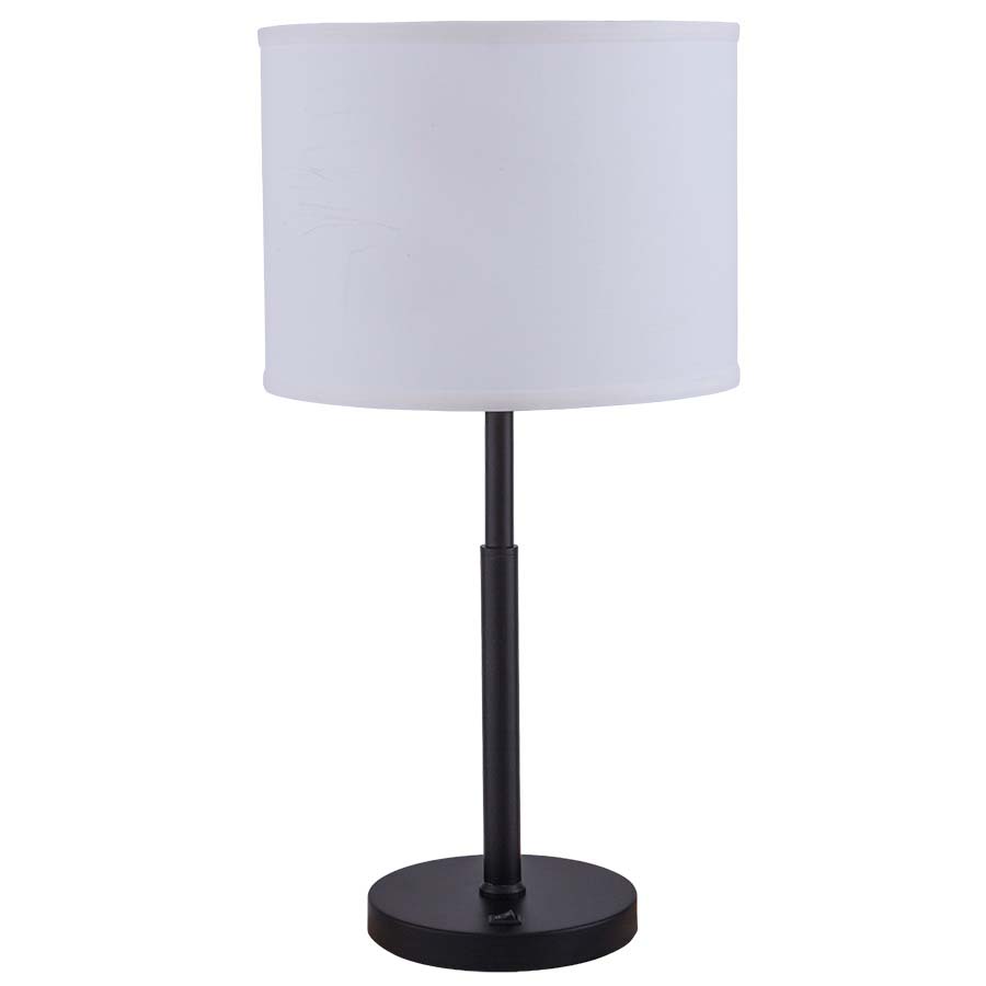 23"H Matte Black Table Lamp, medium base socket, on/off rocker base switch, 8' Black 45° Cord out bottom of base, Bolt down with two metal 1-1/8" prongs out bottom of base (not shown), 12x12x9 White Linen Hardback Shade. Recommend 1100 lumen LED bulb.