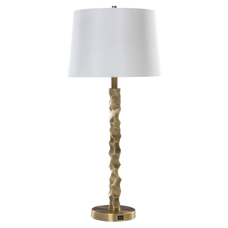 29-1/4" Brushed Brass Table Lamp, medium base socket, on/off rocker base switch, 8' Silver 45° cord, with 11-1/2x13x9 White Faux Silk Shade. Recommend1100 lumen LED bulb.
