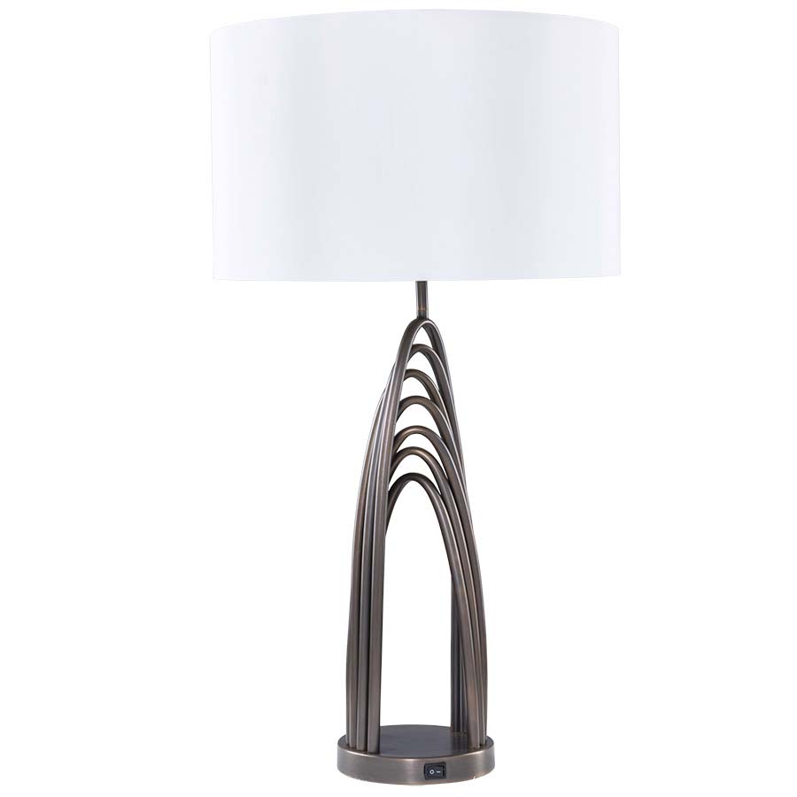 29" Antique Brass Table Lamp, medium base socket, on/off rocker base switch, 8' Silver 45° cord, 15x15x9 White Faux Silk Shade. Recommend 1100 lumen LED bulb.