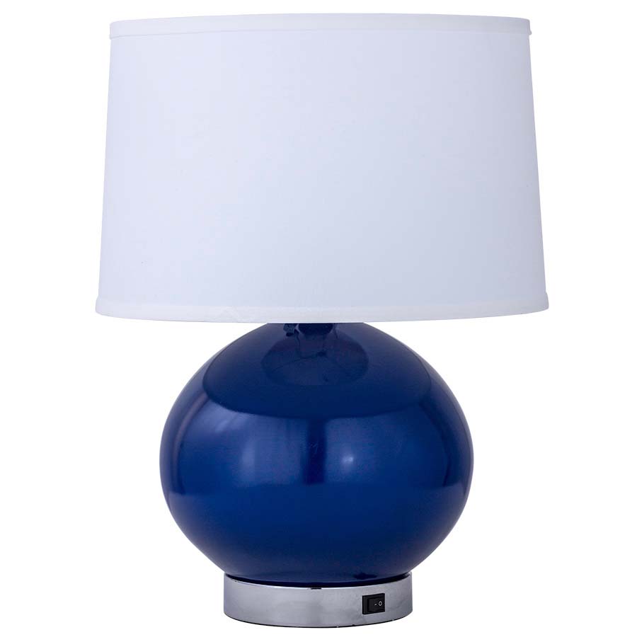 18.75"H Solid Blue Resin and Polished Chrome Table Lamp, medium base socket, on/off rocker base switch, 8' Silver 45° Cord. With 13x14x9 White Linen Hardback Shade. Recommend 1100 lumen LED bulb.