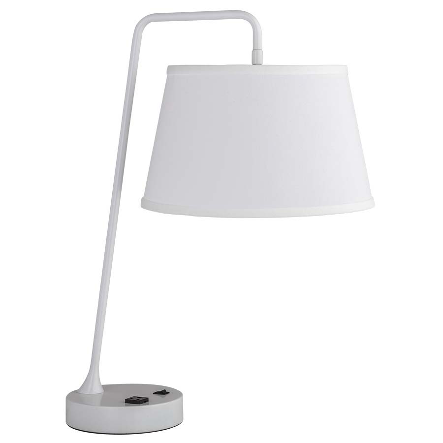 24" Signal White Table Lamp, medium base socket, on/off rocker base switch, one convenience outlet, 8' Silver 45° 3-prong grounded cord, with 10x13x8 White Linen Hardback Shade. Recommend 1100 lumen LED bulb.