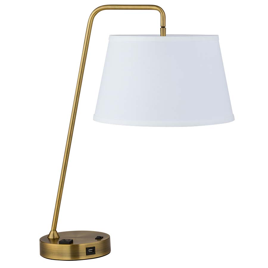 24"H Brushed Brass Table Lamp, medium base socket, on/off rocker base switch, one outlet, dual USB A + C port, 8' Silver 45° 3-prong grounded cord, includes 10"x13"x8" White Linen Hardback Shade. Recommend 1100 lumen LED bulb.