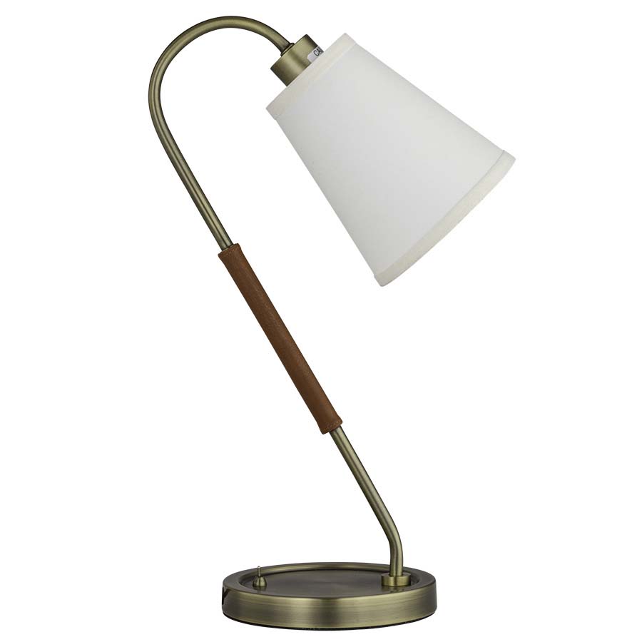20" Antique Brass with Brown Leather accent Table Lamp, medium base socket, on/off toggle switch, 8' Black fabric 45° Cord, with 3.5x6x7 Cream Linen HB Shade. Recommend 1100 lumen LED bulb.