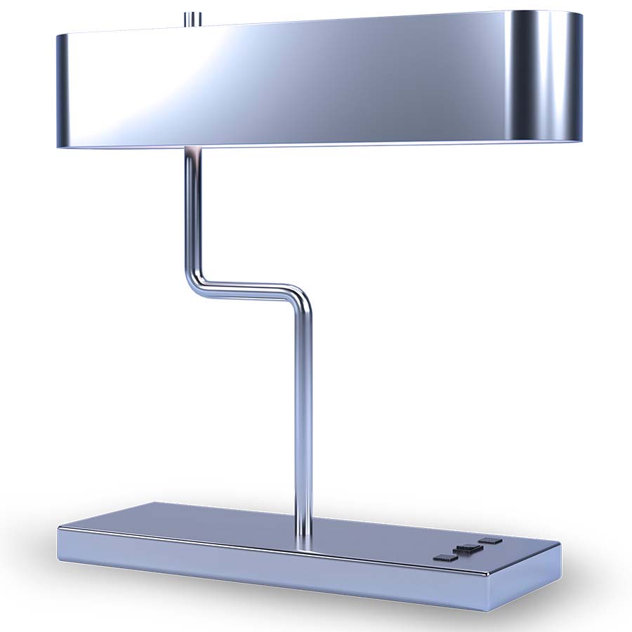 18" Brushed Nickel LED Table Lamp, 10 watt LED, on/off rocker base switch, 800 Lumens, 3000K color temp, 90 CRI, with one outlet, one USB port, 8' Silver 45° 3-prong grounded cord. With Brushed Nickel Metal Shade with White Powder Coated Interior.