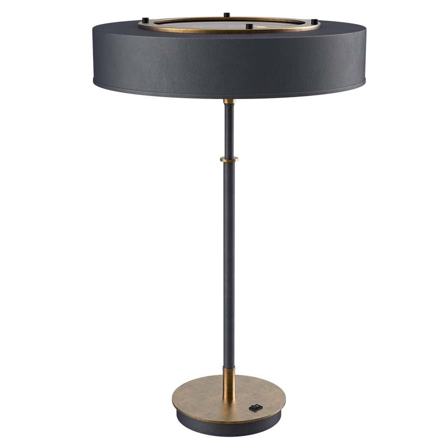 23.75"H Warm Antique Brass and Painted Gun Metal Table Lamp, "S" Arm with two medium base sockets, on/off rocker base switch, 8' Silver 45° Cord, with Painted Gun Metal Metal Shade and Perforated Metal Top Diffuser. Recommend two 1100 lumen LED bulbs.