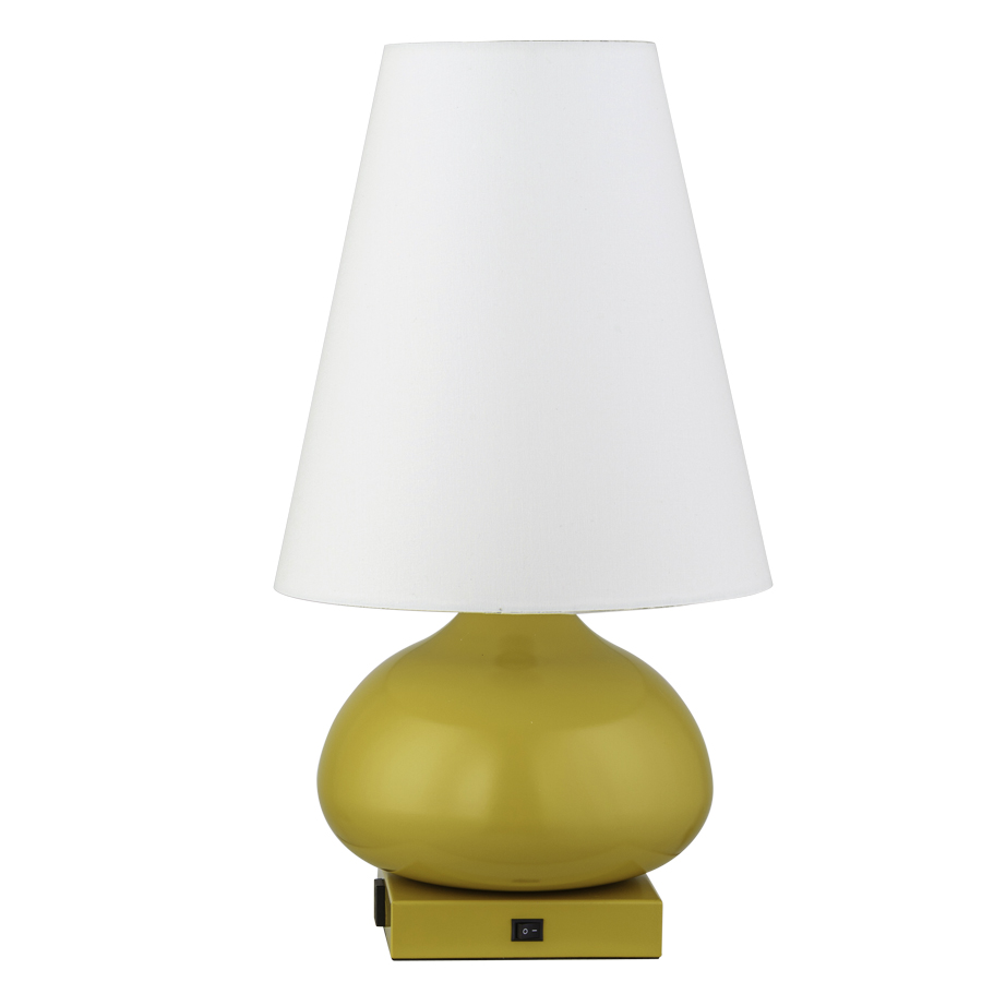 23"H Powder Coat Metallic SW6685 Trinket Table Lamp, medium base socket, on/off rocker base switch, one outlet, 8' Silver 45° 3-prong grounded cord, 7"x13"x14.5" Cream Linen Hardback Shade, recommend 1100 lumen LED bulb