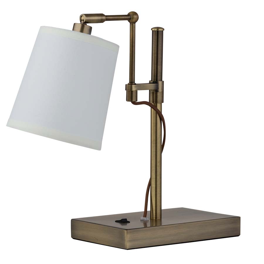 15" H Brushed Brass swivel Table Lamp, one E12 Socket, on/off rocker base switch, 8' Orange fabric 45° cord, with 5 x 6 x 6.5 Cream Linen HB Shade. Recommend one 2.8 watt LED candelabra bulb.