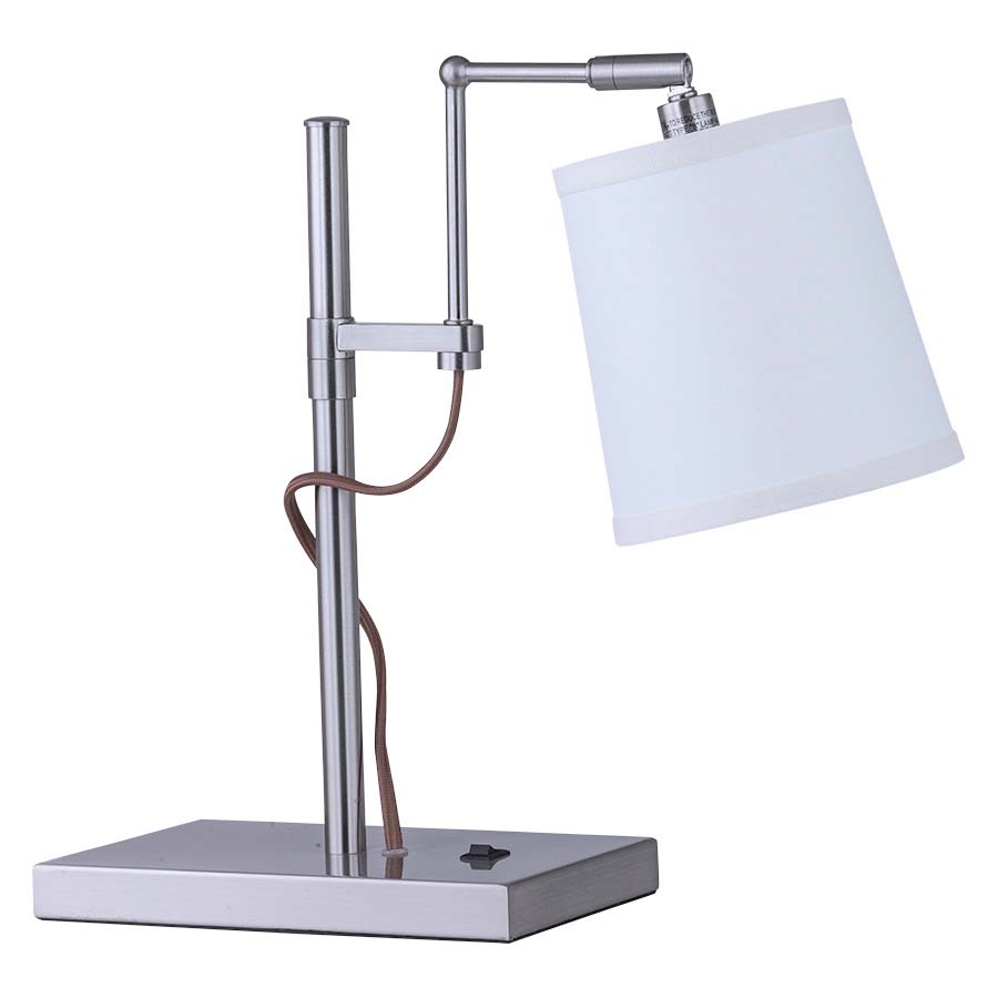 15" H Brushed Nickel swivel Table Lamp, one E12 Socket, on/off rocker base switch, 8' Orange fabric 45° cord, with 4.5 x 5 x 6 Cream Linen HB Shade w/ rolled edges. Recommend one 2.8 watt LED candelabra bulb.