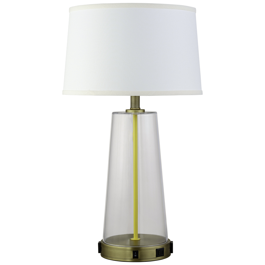 26.25"H Clear Glass and Brushed Brass Table Lamp, medium socket, rocker switch, two outlets, dual USB A + C port, 8' silver 45° 3-prong grounded cord, yellow center pipe, 13"x14.5"x9" Cream Linen Hardback Shade with Frosted White acrylic top diffuser. Recommend 1100 lumen LED bulb