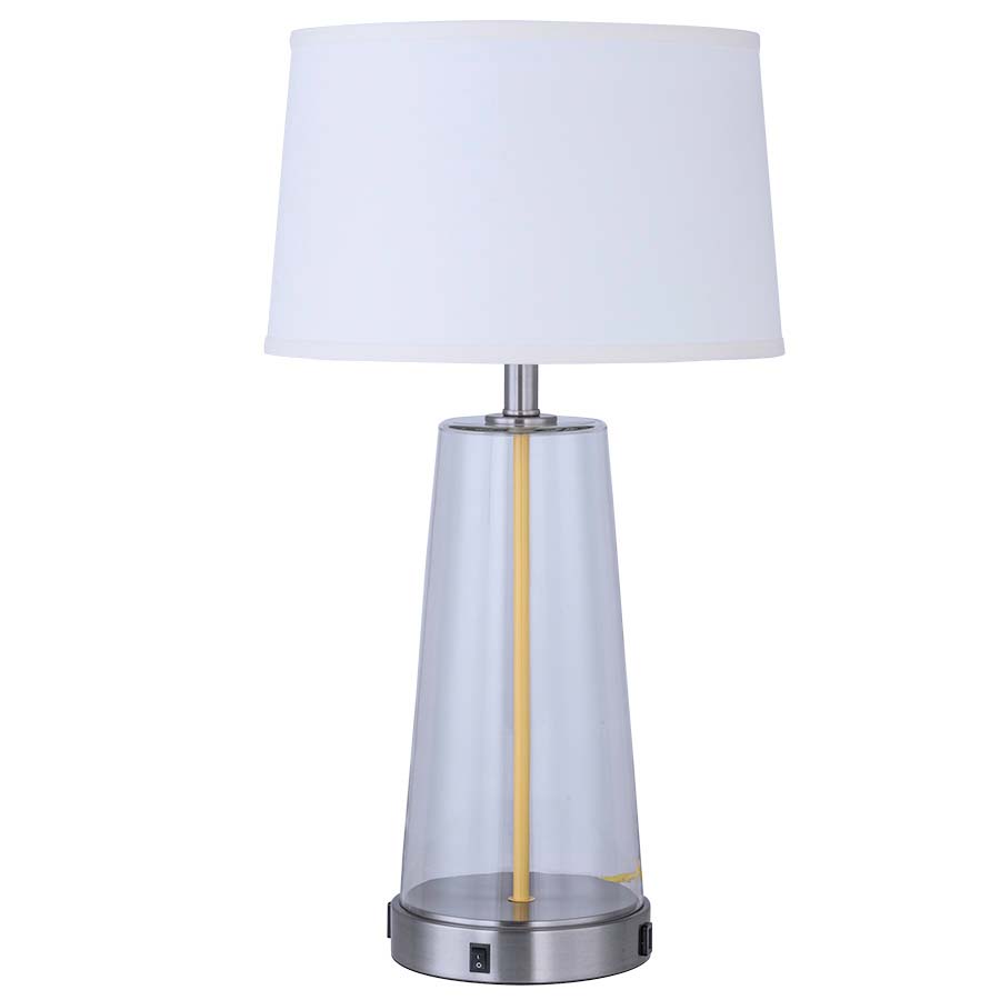 26.25"H Clear Glass & Brushed Nickel Table Lamp, medium socket, rocker switch,1 outlet,1 dual USB,8' silver 45° 3-prg grd cord, yellow center pipe,14.5x14.5x9 Cream Linen HB Shade w/ rolled edges & Frosted White acrylic top diffuser.Recommend 1100 lumen LED bulb