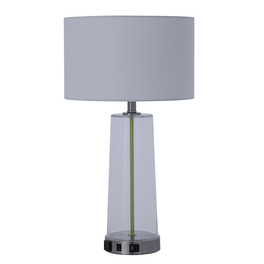 26.25"H Clear Glass & Brushed Nickel Table Lamp, medium base socket, on/off rocker base switch, one outlet, one dual USB port A+C, 8' silver 45° 3-prong grounded cord, center pipe to match Pantone 14-0647 TPG Celery,14.5x14.5x9 Cream Linen HB Shade w/ rolled edges & Frosted White acrylic top diffuser. Recommend 1100 lumen LED bulb