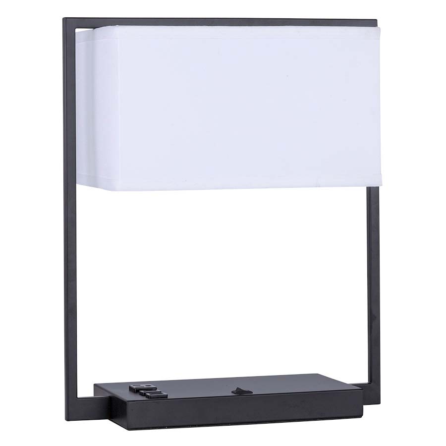 18" Matte Black Table Lamp, medium base socket, on/off rocker base switch, one convenience outlet, two USB ports, 8' Silver 45° 3-prong grounded cord, 9x12x9x12x7 Rectangle White Linen Hardback Shade. Recommend 1100 lumen LED bulb.