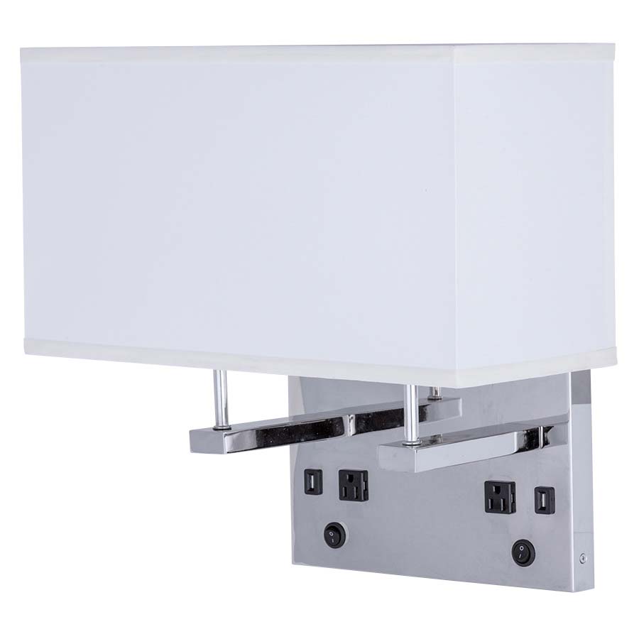 18" Polished Nickel Double Wall Lamp, 2-medium skts, 2-on/off round rocker switches at backplate, 2-outlets, 2-USB ports, 8' Silver 45° 3-prg grounded cord exiting out back of lamp, 8x18x8x18x10 Rect Cream Linen HB Shade.Recommend 2-1100 lumen LED bulbs