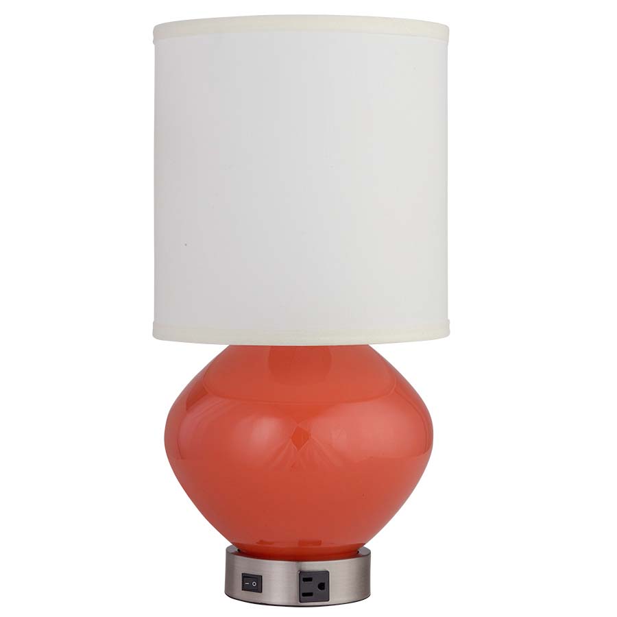 18.75"H Coral Glass and Brushed Nickel Table Lamp, medium base socket, on/off rocker base switch, one outlet, 8' Silver 45° 3-prong grounded cord. with 10x10x10.5 Cream Linen HB Shade. Recommend 1100 lumen LED bulb.