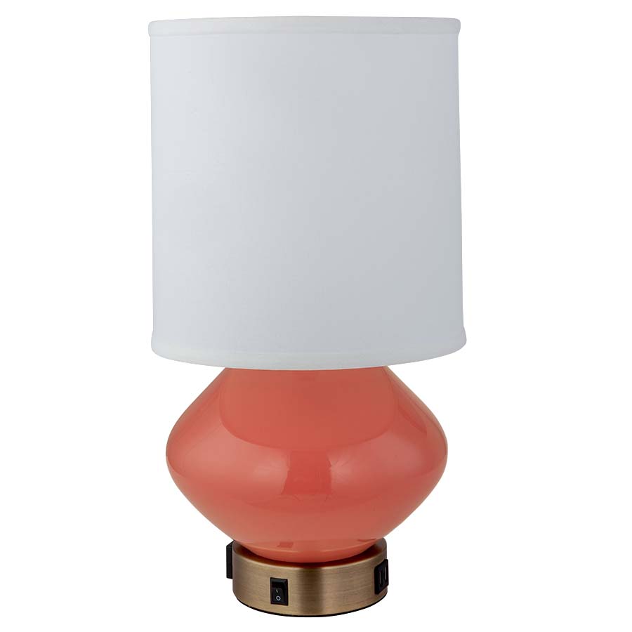 This glass desk lamp in bright coral adds a pop of color that enlivens any space. The desk lamp with shade features a brass base and cream linen shade.