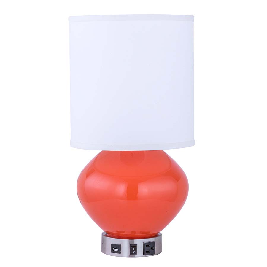 18.75"H Coral Glass and Brushed Nickel Table Lamp, medium base socket, on/off rocker base switch, one outlet, one dual USB port, 8' Silver 45° 3-prong grounded cord. with 10x10x10.5 Cream Linen HB Shade w/ rolled edges. Recommend 1100 lumen LED bulb.