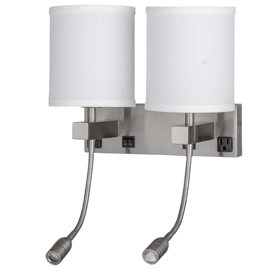 Brushed Nickel Double Wall Lamp, GU24 sockets and 1 watt LED gooseneck reading lights, dual rocker switches, two outlets. Universal Mount. 8' Silver 45° Cord to exit bottom of the lamp. 6x6x7 White Linen HB shades. Recommend two 1100 lumen LED bulbs