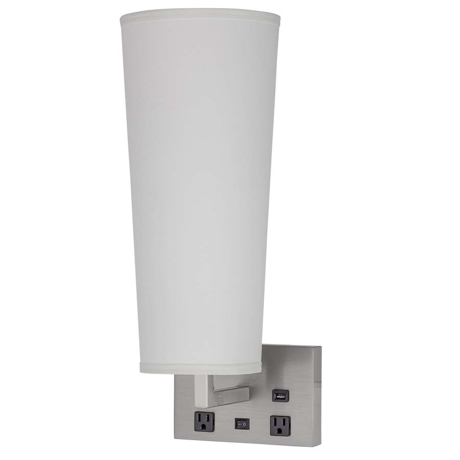 22"H Brushed Nickel Wall Lamp, GU24 Socket, on/off rocker switch at back plate, two outlets, two USB ports, 6' Silver 45° 3-prong grounded cord exiting back of lamp, 8x6x18 Cream Linen HB Shade. Recommend 1100 lumen LED bulb with GU24 base.